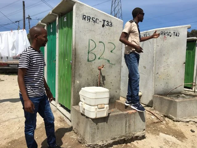 Community Activists with the Social Justice Commission explain toilet options for residents of the Khayelitsha township in Cape Town, South Africa.